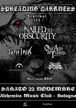 Un concerto ricco di ospiti internazionali con l'oscuro death metal melodico a tinte progressive dei Nailed To Obscurity che saranno gli headliner della serata, con la loro proposta tanto malinconica quanto brutale. Ad accompagnarli ci saranno band speciali del calibro Yoth Iria da Atene con il loro black metal romantico e Oak Ash & Thorn con la loro proposta estrema dall'impronta pagana e folk, entrambi alla loro primissima presenza in Italia!